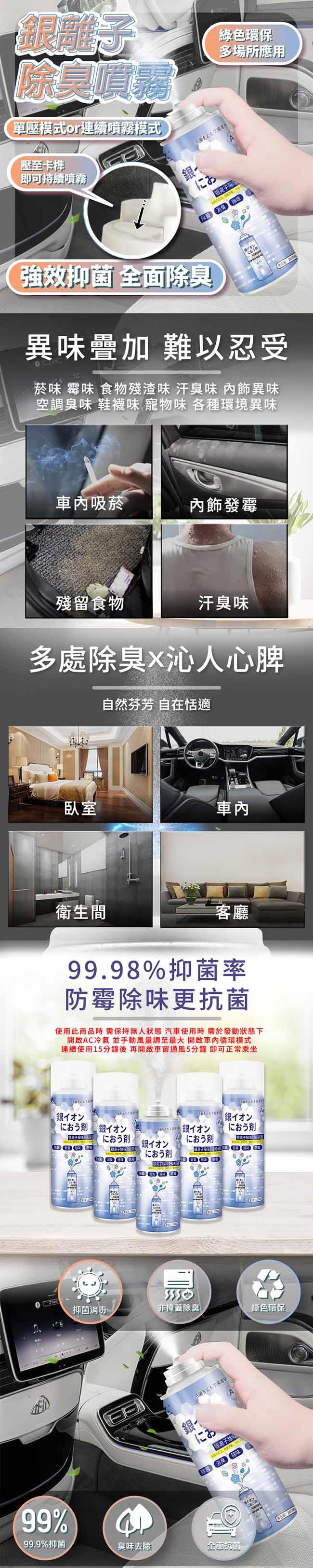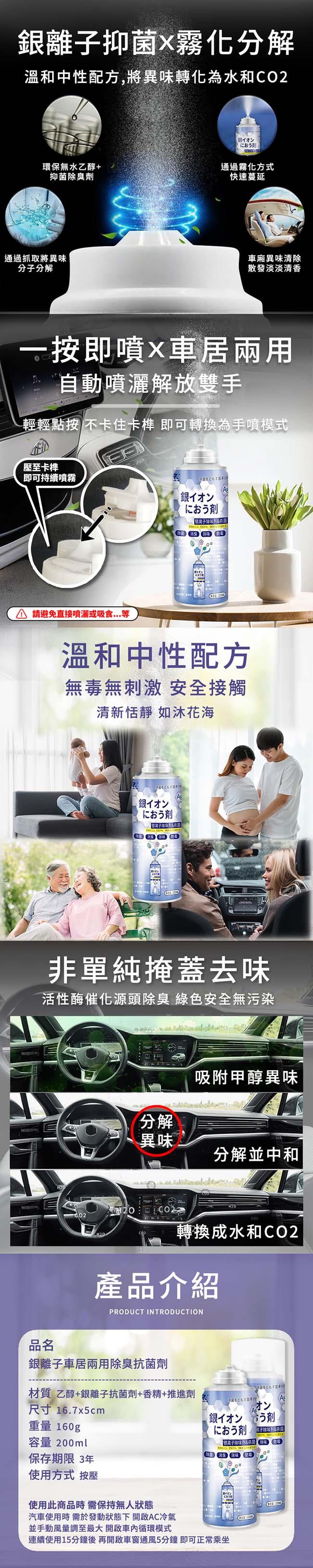 品名:銀離子車居兩用除臭抗菌劑 型號:AG1 材質:乙醇+銀離子抗菌劑+香精+推進劑 顏色:藍色 尺寸:16.7x5cm 重量:160g 容量:200ml 保存期限:3年 使用方式:按壓 適用範圍:車內/居家 包裝尺寸:16.7x5cm 包裝重量:160g 商品內容:除臭劑x1 商品產地:中國