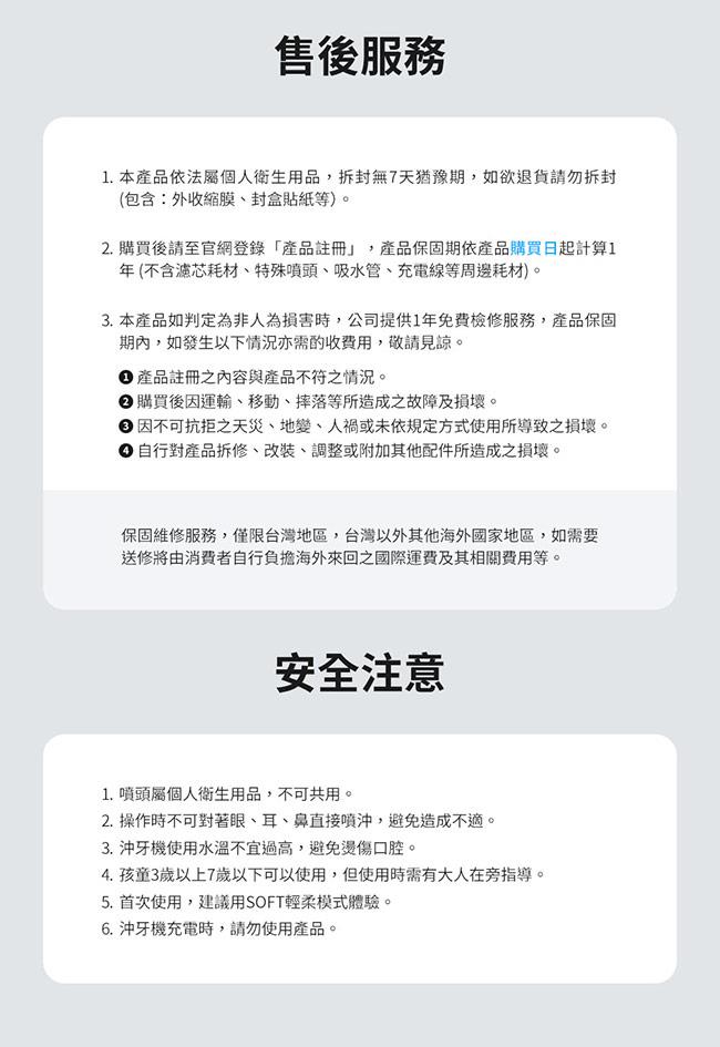 ◆配件:標準噴頭x2、水牙刷x1、磁吸式充電線x1