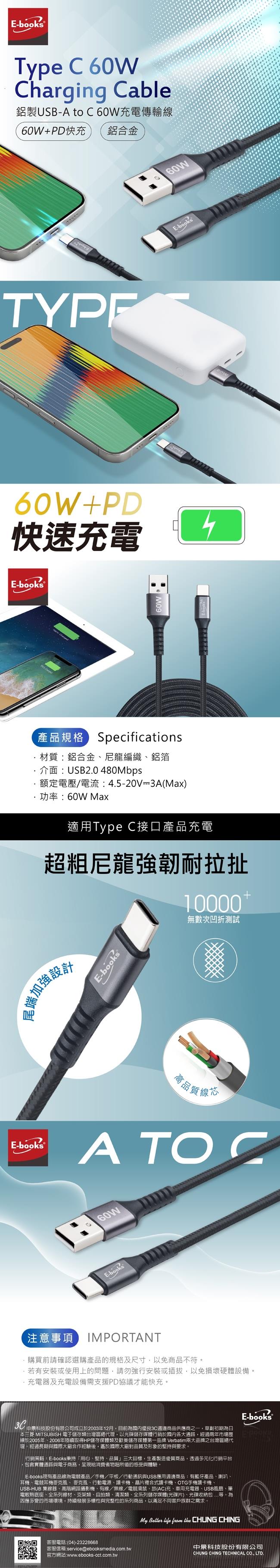 E-books XA40 鋁製USB-A to C 60W充電傳輸線-1M+2M