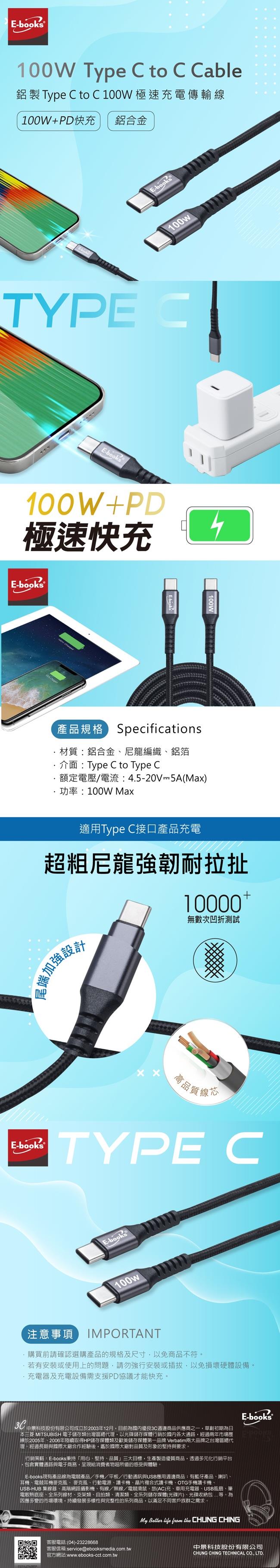 E-books XA44 鋁製Type C to C 100W極速充電傳輸線-1M+2M