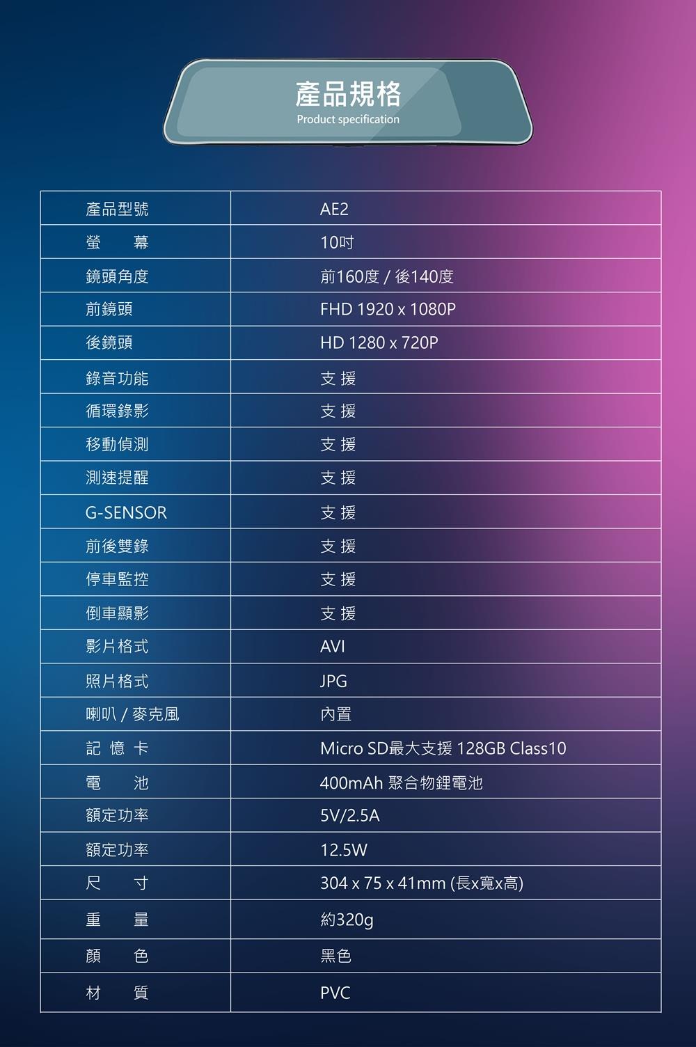 包裝內容物:AE2 行車記錄器主機、車充電源線、720P後鏡頭組、GPS天線包、32G記憶卡、USB連接線、固定橡皮圈兩條、說明書、保固書