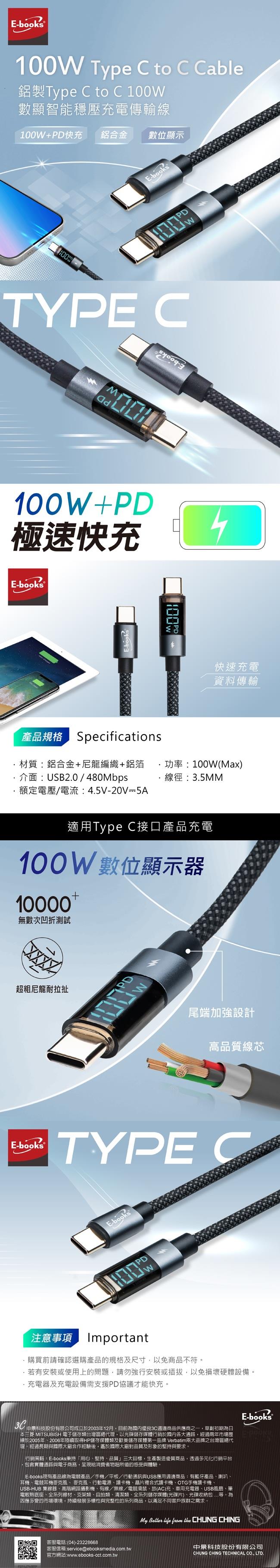 E-books XA49 鋁製Type C to C 100W數顯智能穩壓充電傳輸線-2M