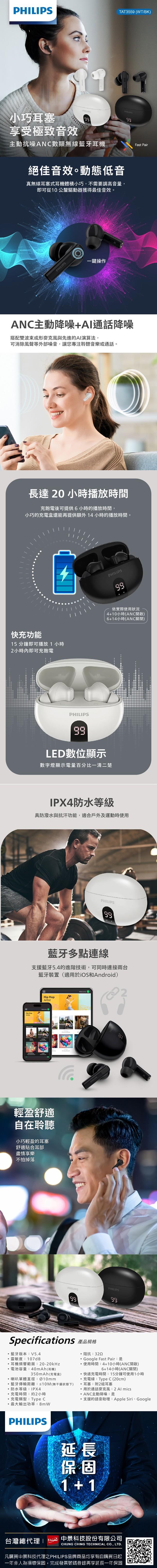 PHILIPS 主動抗噪ANC數顯無線藍牙耳機(白)-TAT3559WT