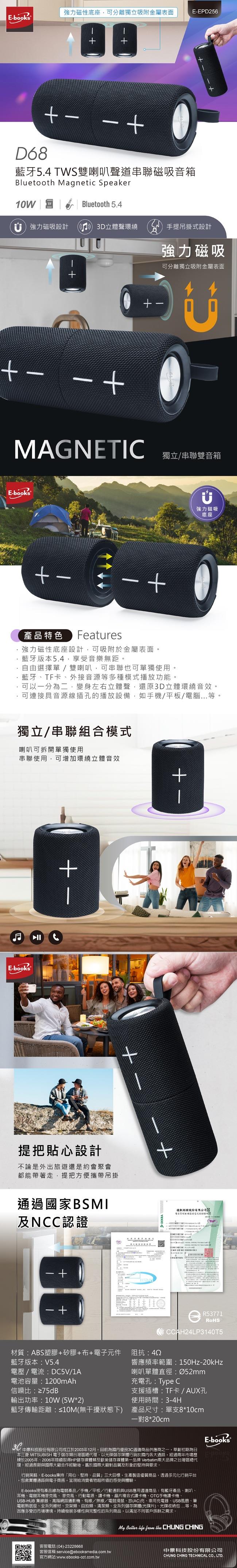 E-books D68 藍牙5.4 TWS雙喇叭聲道串聯磁吸音箱