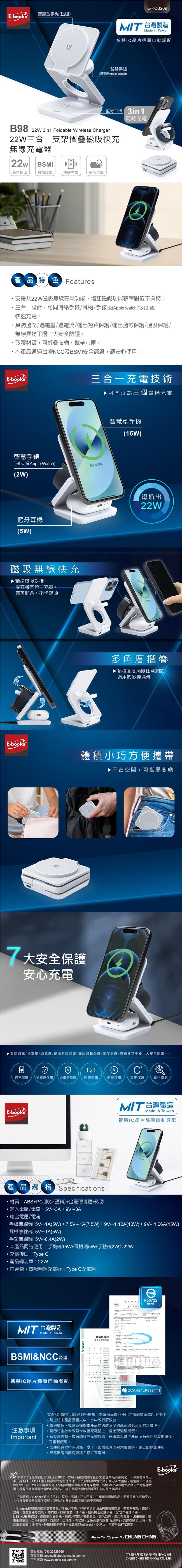 E-books B98 【台灣製造】22W三合一支架摺疊磁吸快充無線充電器