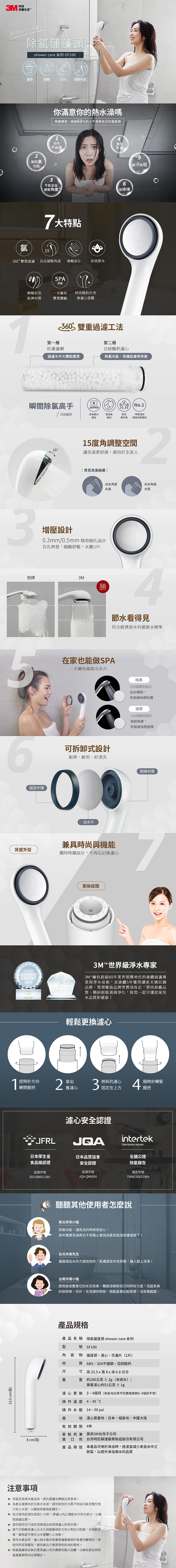 ◆型號:SF100 ◆內容物:蓮蓬頭1支、濾心共2支、花灑片2片 ◆材質:ABS、304不鏽鋼、亞硫酸鈣 ◆商品尺寸:高23.5 x 寬8 x 深6.8 cm ◆商品重量:186±2g(未過水)/單支濾心約51±1g ◆濾心壽命:約使用3~4個月(依各地水質不同更換週期3~4個月不等) ◆操作溫度:4~45℃ ◆操作水壓:14~50psi ◆效期:4年 ◆產地:濾心原產地-日本/組裝地-中國大陸 ◆國際條碼:4710367459644