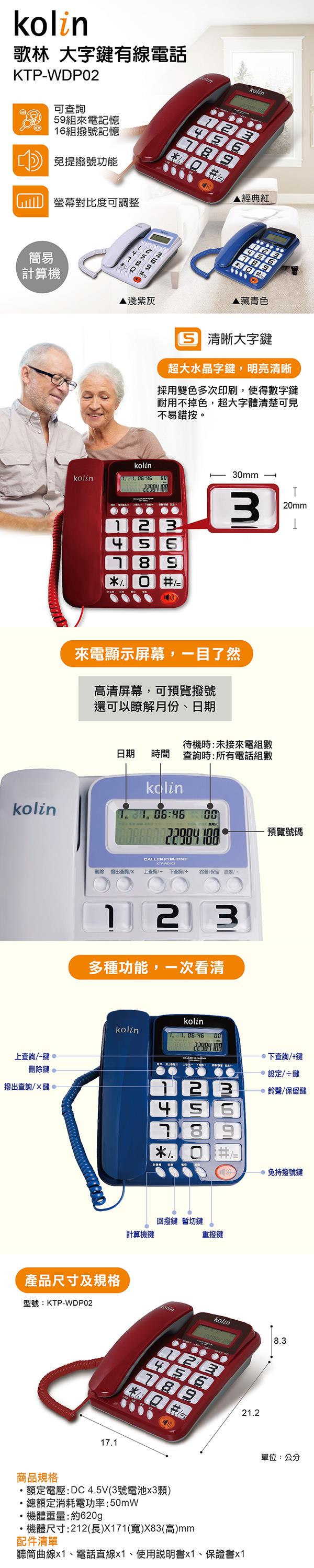 KOLIN 大字鍵有線電話 KTP-WDP02 淺紫灰